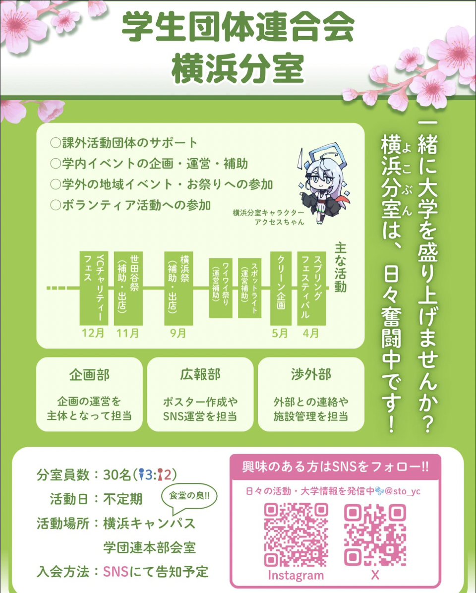 東京都市大学 学生団体連合会は東京都市大学における学生団体(サークル活動、部活動など)の総括をしている学生主導の団体です。本部は世田谷キャンパスにあり、横浜分室は主に横浜キャンパスで活動する学生団体の総括をしています。